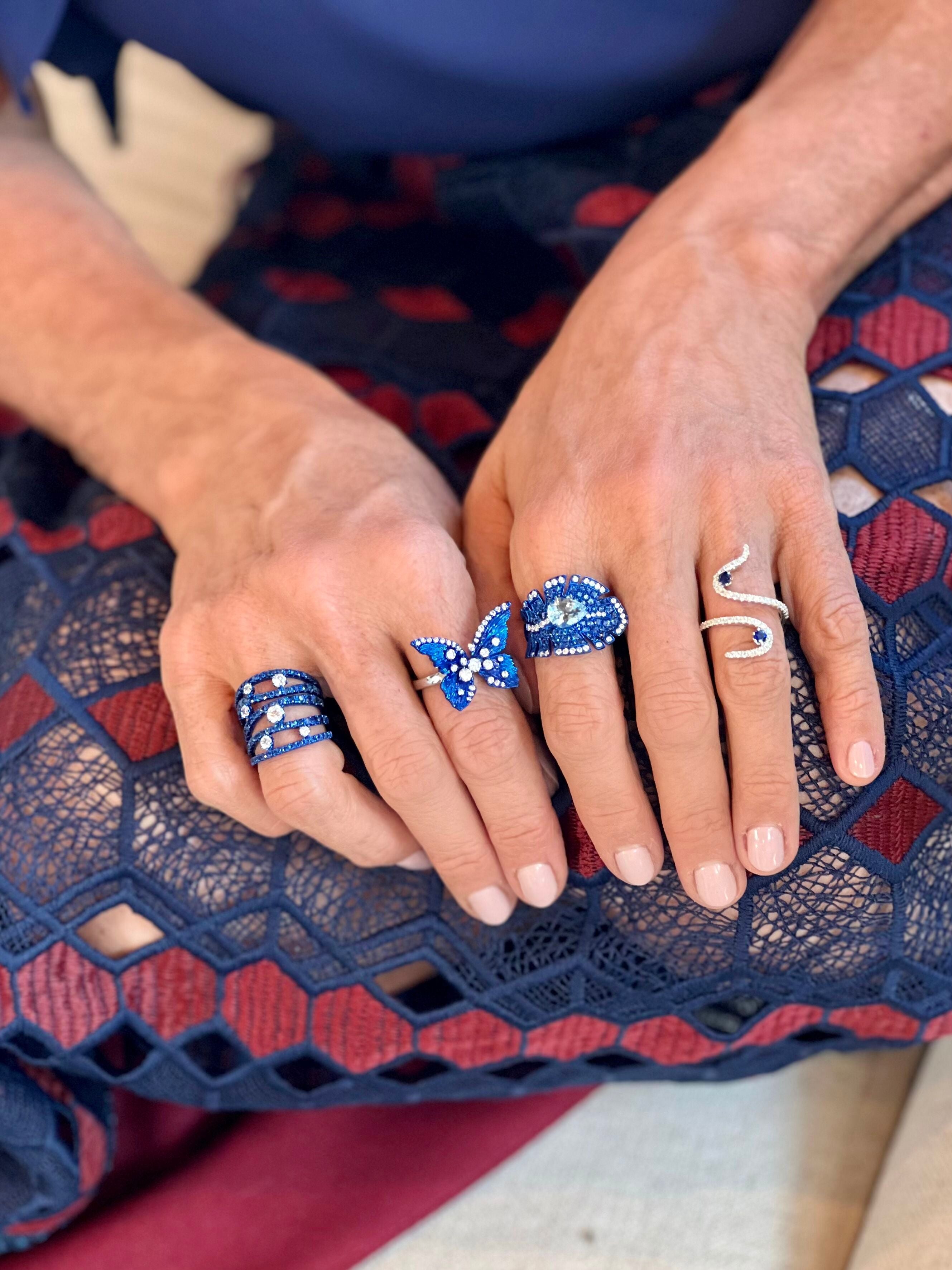 The color and subtle variations of blue sapphire make it a compelling narrator to tell a unique story. Each blue sapphire is responsibly sourced and hand selected for its deep, soulful hue, set in both contemporary designs and nature-inspired shapes, as Graziela’s home country of Brazil is her muse.